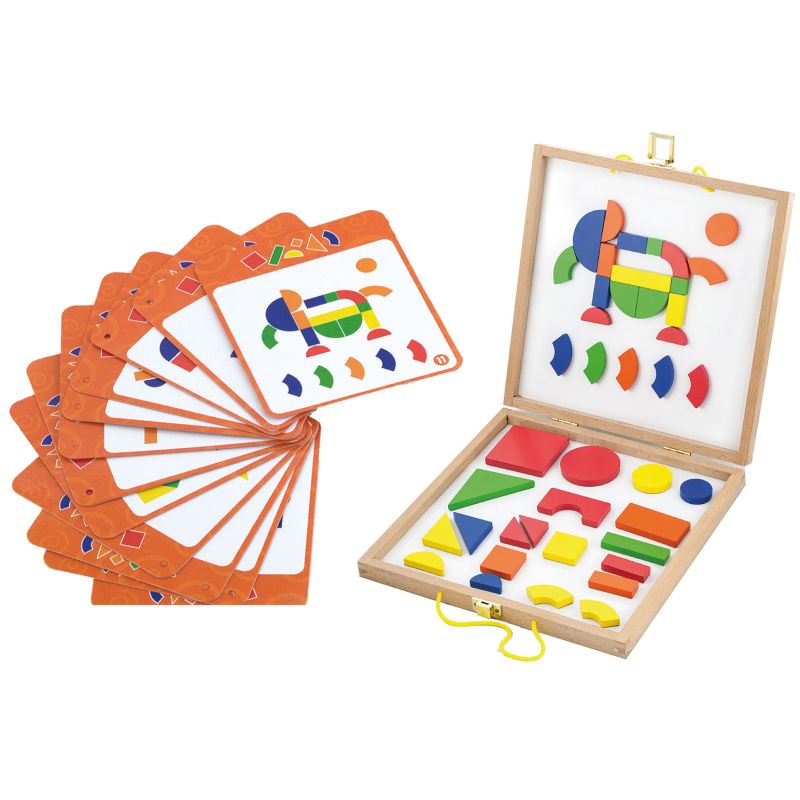 42 piezas magnéticas de diferentes formas geométricas y colores.