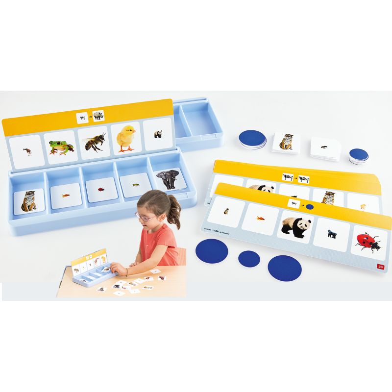 Contenido: 28 fichas dobles de actividades, 20 fichas de animales, 24 fichas circulares y dos cajas.