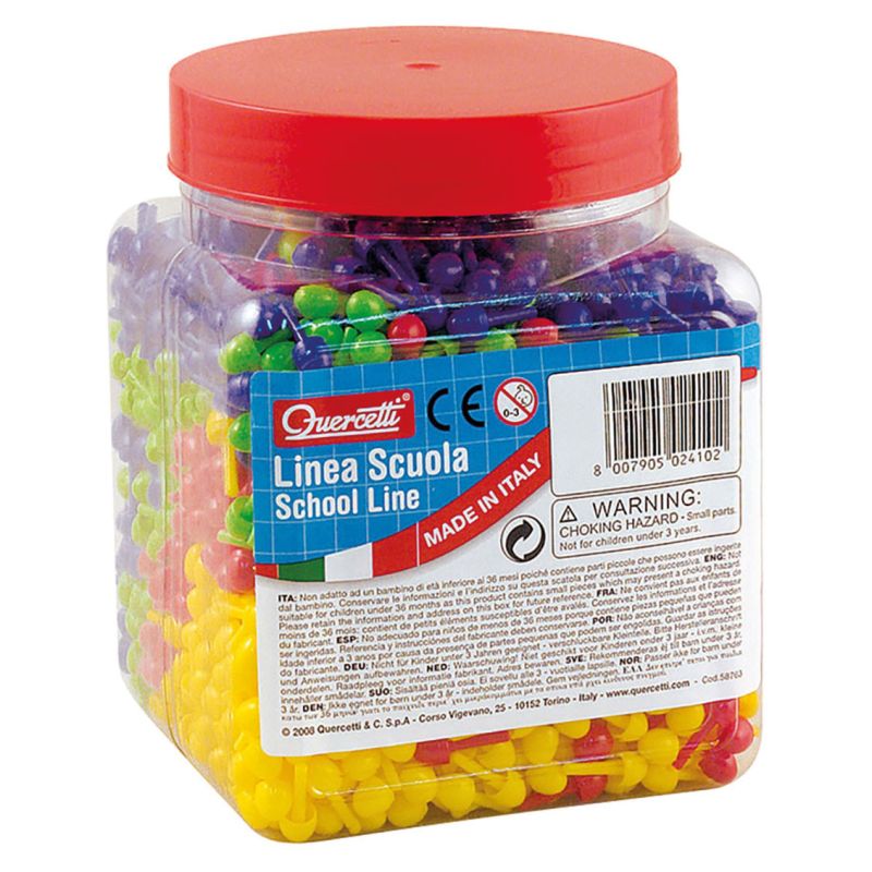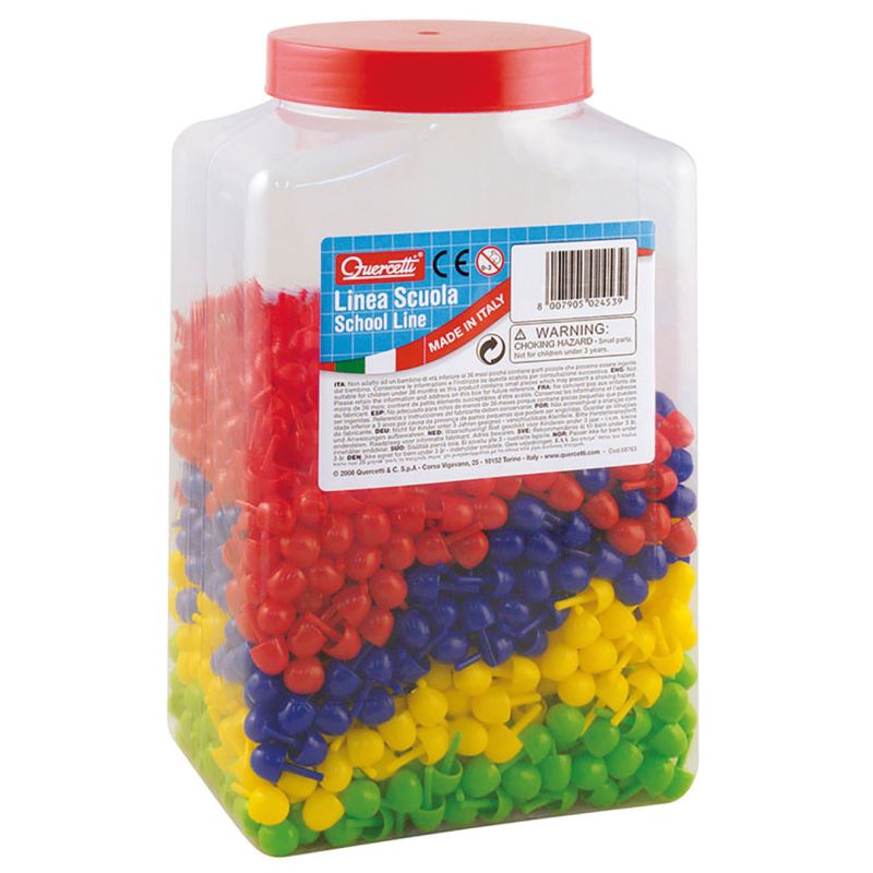 220449: ¡Crea divertidas composiciones estas chinchetas! - Estimula la coordinación y la motricidad. - Fomenta la concentración. - Desarrolla la percepción visual. - Crea diferentes tipos de composiciones siguiendo los modelos o realizando composiciones libres. Elige el modelo que quieras: Chinchetas pequeñas: 1800 unidades de 10 mm de diámetro, en diferentes colores. A partir de 5 años. Chinchetas medianas: 780 unidades de 15 mm de diámetro, en diferentes colores. A partir de 4 años. Chinchetas grandes: 360 unidades de 20 mm de diámetro, en diferentes colores. A partir de 3 años. Placas mosaico: 5 placas blancas, perforadas de 28x19cm. Con 92 modelos.