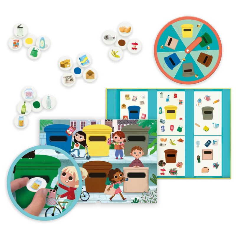 Contenido: lámina de 26 x 19 cm, caja con 6 compartimentos, 46 fichas de residuos de 2,5 cm diámetro, ruleta de 13,5 cm diámetro.