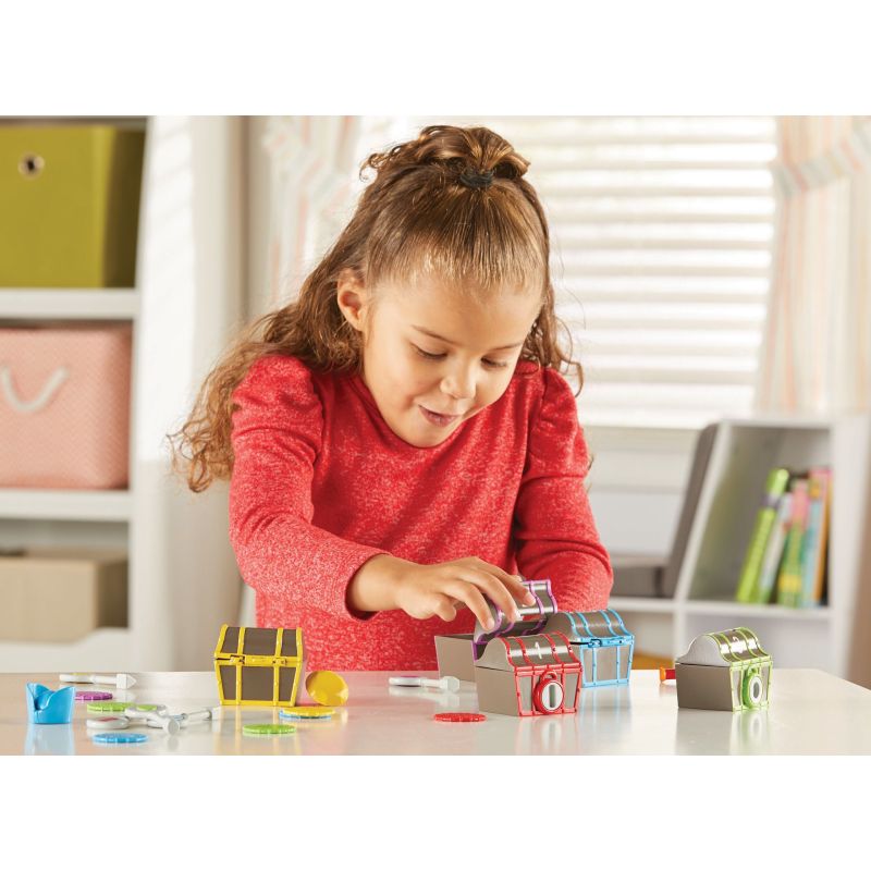 Contenido: 5 cofres el tesoro numerados en plástico, 5 llaves con formar geométricas en plástico, 5 tesoros sorpresas de 5 colores en plástico: pulpo, loro, sombrero, diamante y catalejo y guía de actividades.