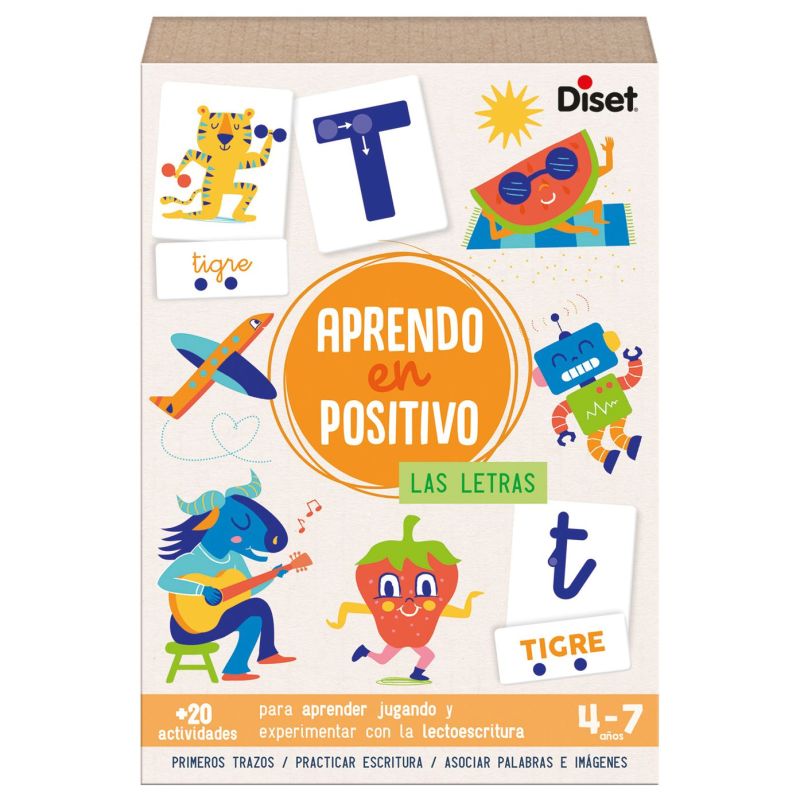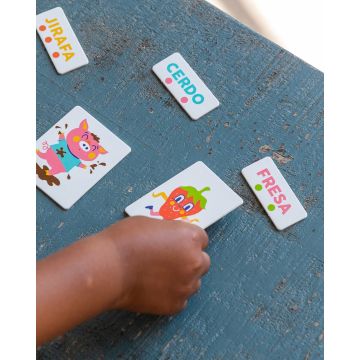 Contenido: 77 tarjetas a doble cara con letras mayúsculas y minúsculas, 27 tarjetas con ilustraciones, 27 tarjetas de palabras con puntos de colores que señalan el número de sílabas, ruleta, pizarra borrable con cuadrícula de escritura, juego del gato y el ratón y crucigrama, rotulador borrable para la pizarra, póster y guía visual del contenido.
