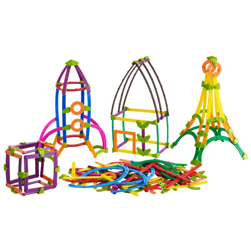 110 palitos rectos y curvos realizados en plástico flexible y duradero en 13 tamaños. De 3 cm. a 15 cm. La piezas curvas tienen marcas de ángulos y las piezas rectas incluyen medidas de longitud en centímetros.
