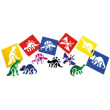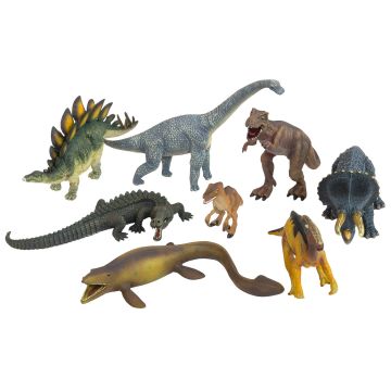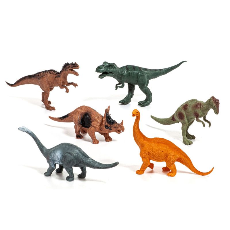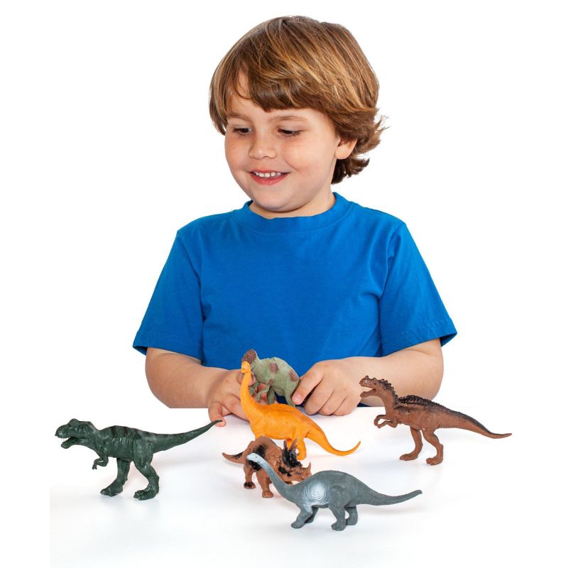- 6 dinosaurios diferentes: pachycephalosauro, brontosauro, stegosaurus, T-rex, velociraptor y triceratops.