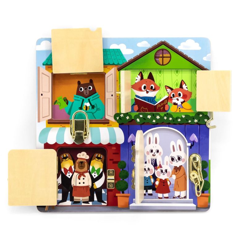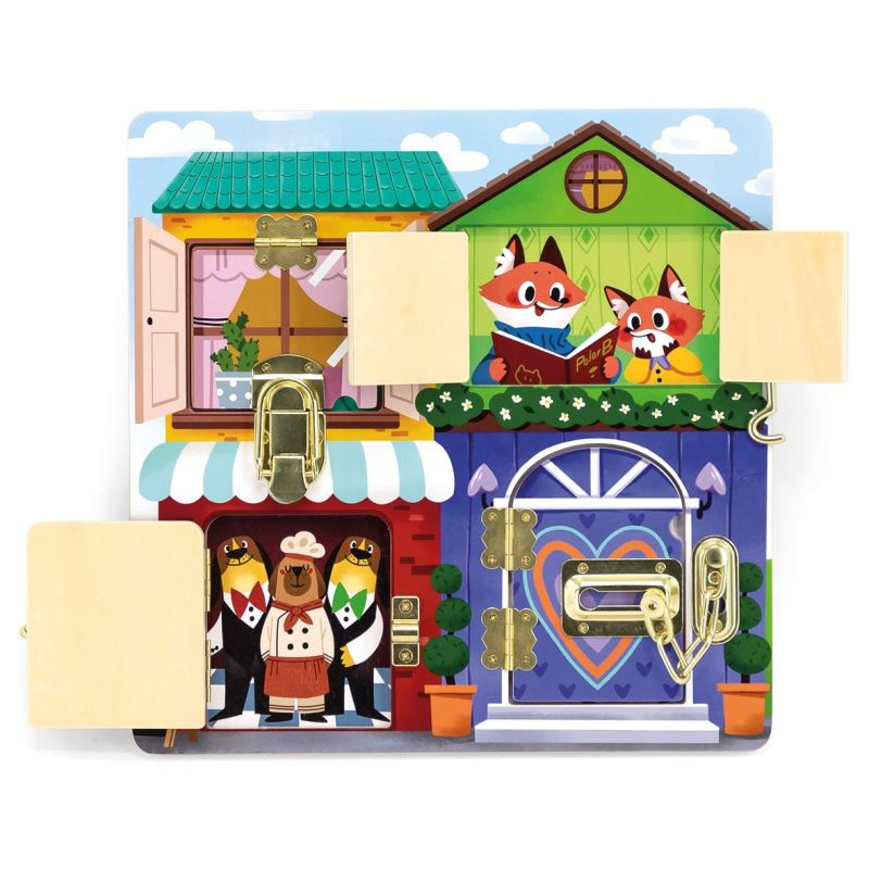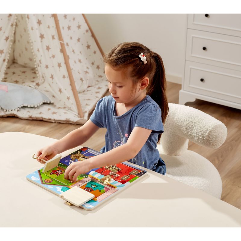 Tablero de cerraduras basado en la metodología Montessori que ayuda al desarrollo psicomotor de los más pequeños.