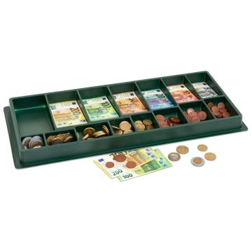 1 tablero base de cartón de 3 piezas de 40x20 cm., 26 tarjetas de acción, 4 tarjetas de lista de compra, 30 monedas, 24 fichas-bolsa, 4 peones-personajes, 1 dado y 1 librito instrucciones.