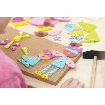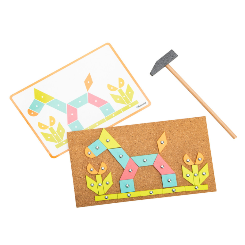 ¡Clásico juego de habilidad! ¡Diviértete creando composiciones propias o recreando las plantillas con este fantástico juego de martillos y clavos! - Fomenta la concentración. - Estimula la percepción visual. - Favorece la imaginación y la creatividad. - Desarrolla la motricidad y la coordinación. - Promueve el reconocimiento de formas y colores. - Clava las piezas en las láminas de corcho siguiendo los modelos o realizando composiciones libres. Especificaciones: Edad recomendada: a partir de 4 años. Contenido: 200 teselas de madera de 3 mm de grosor, en 7 formas, diferentes tamaños y en 5 colores. De 2 cm. a 4 cm. 4 placas base de corcho de 25 cm x 15,5 cm x 1 cm. 4 martillos de madera de 19 cm. 250 clavos de 11 mm. en una cajita de plástico 5 tarjetas modelos impresas por ambas caras, total 10 diseños.
