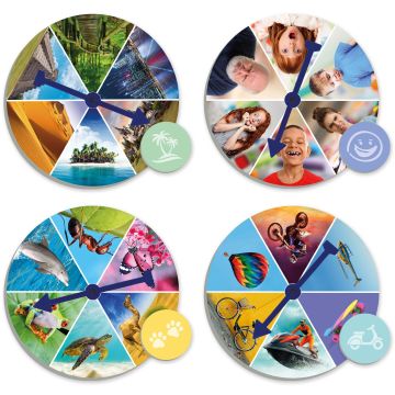 - 8 ruletas de cartón resistente con imágenes reales (11,5 cm. Ø )
