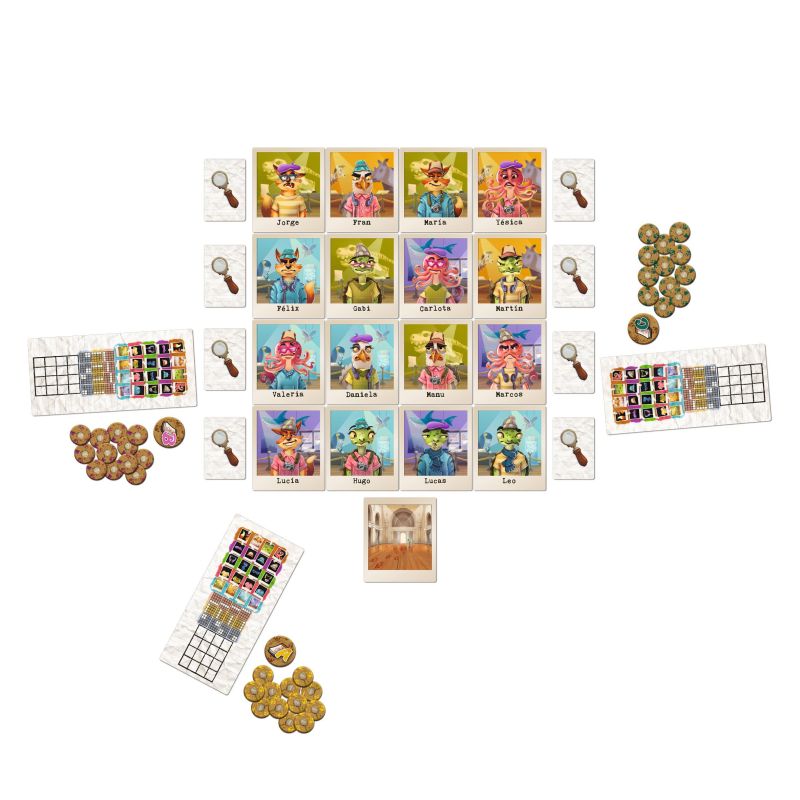 Usa las pistas del museo para encontrar al ladrón o ladrones entre los 16 sospechosos. Anota en tu libreta las pistas para seguir la investigación. Ganará el jugador que más haya apostado por el ladrón (o ladrones) real.