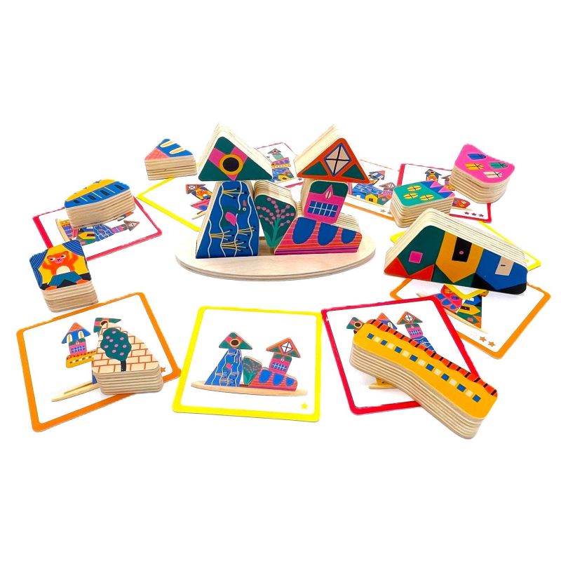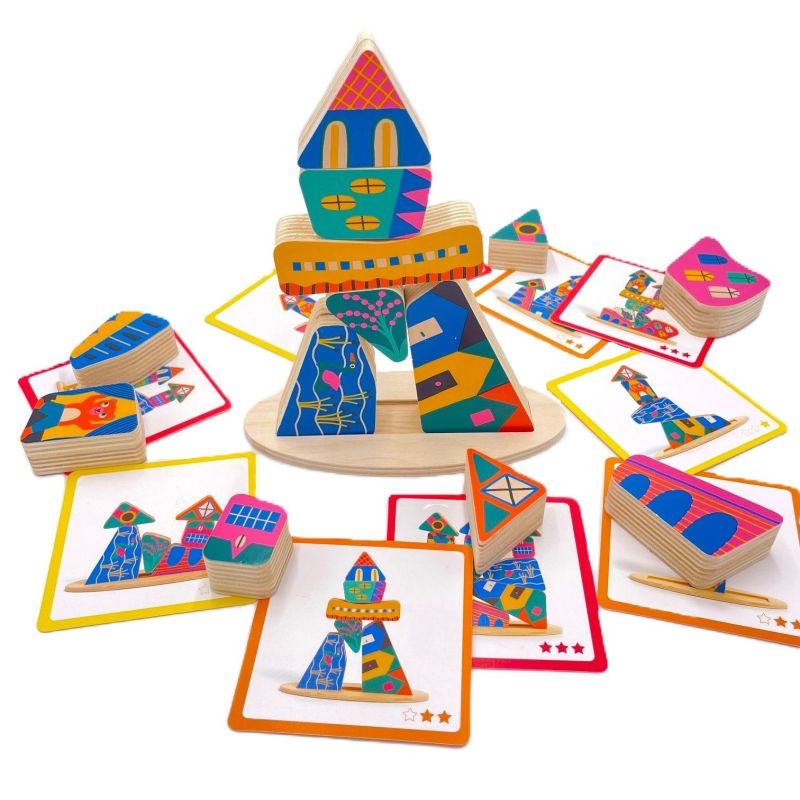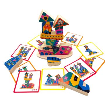 - Reproduce los modelos de las tarjetas con las fichas de madera y consigue el equilibrio perfecto entre ellas.