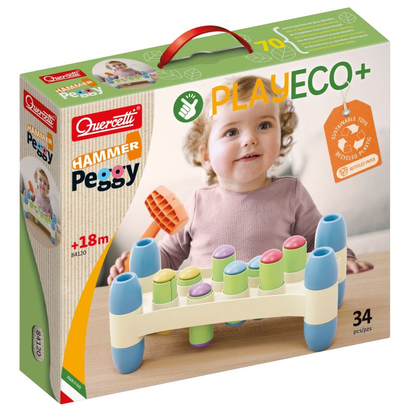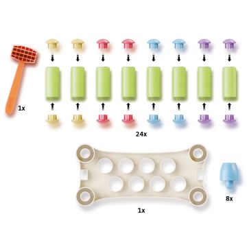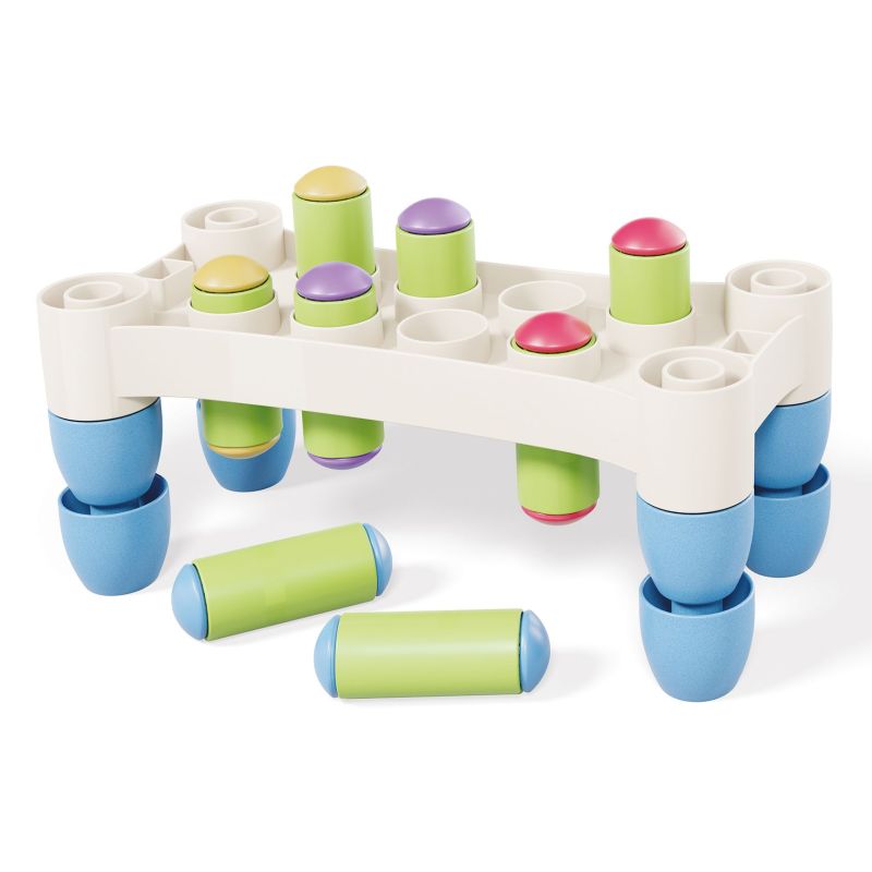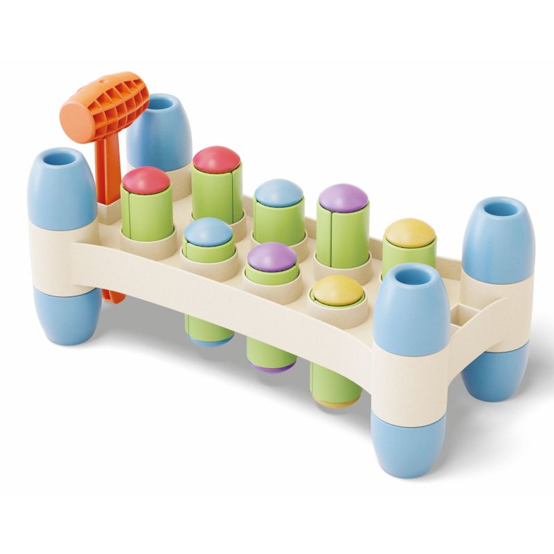 Composición: 34 piezas 100 % ecoplástico: 1 banco de 30 x 15 cm., 8 cilindros de 7 x 3 cm. diámetro, 16 chinchetas para los cilindros de aprox. 3 cm., 8 pivotes de 6 cm para los extremos del banco y 1 martillo de plástico de 16 cm.