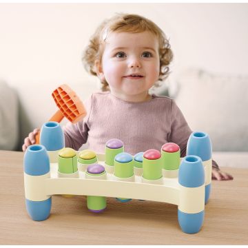 ¡Diviértete y aprende con este banco de formas! Consigue que los más pequeños completen los cilindros con grandes chinchetas en los extremos y coloquen en el banco todas las formas, ayudándose del martillo.