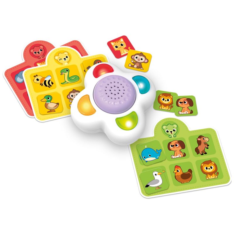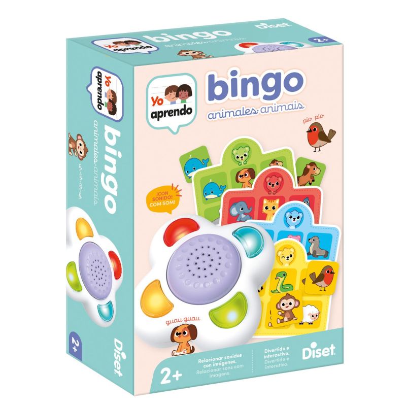Audiobingo, 4 cartones y 24 fichas de animales.