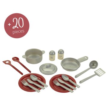 - Incluye 20 accesorios: platos, utensilios de cocina, cacerola y sartén.