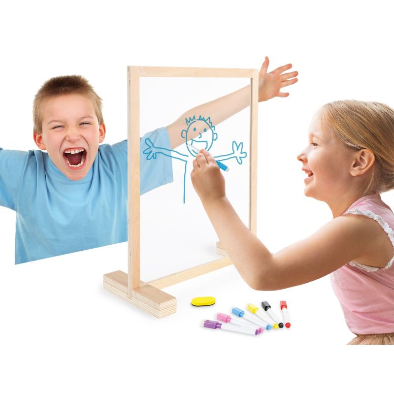 Pizarra transparente con marco de madera ecológico, 2 bases de madera, 6 rotuladores de colores borrables en seco y 1 borrador.