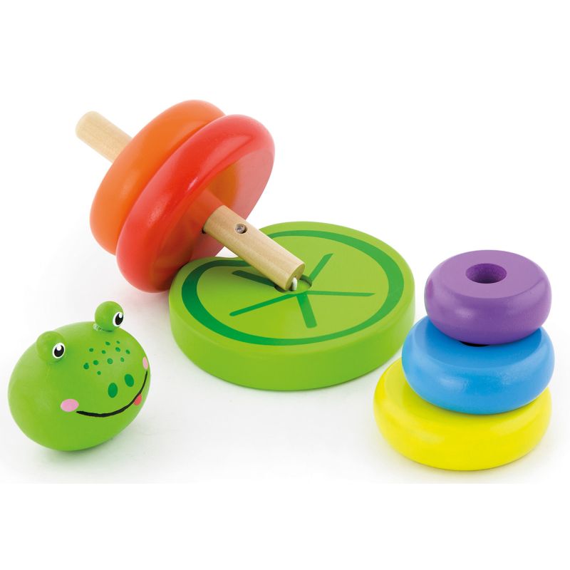 ¡Apila las coloridas anillas y culmina tu pirámide con una divertida cabeza de rana!