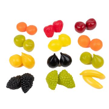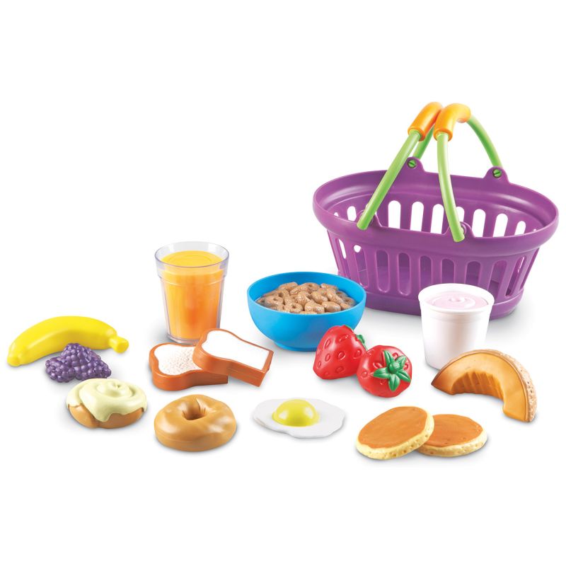 Incluye: cesta de la compra, huevo, panecillo, frutas, vaso de zumo, tazón de cereales, tortitas, bagles y recipiente de yogur.