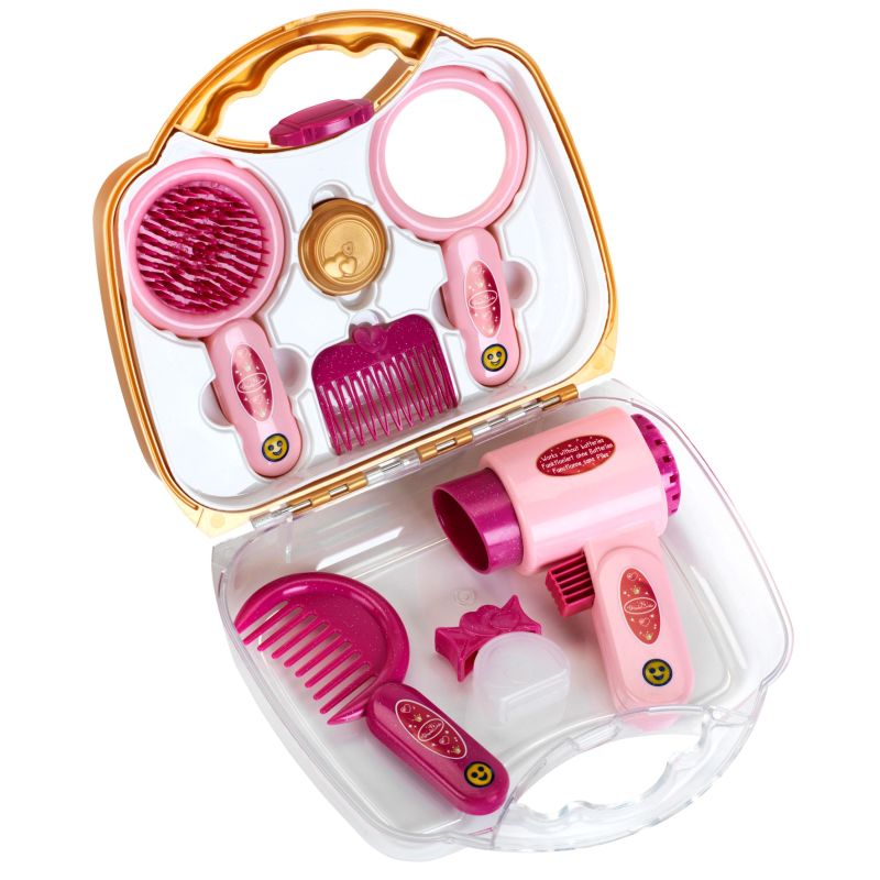 - Incluye: incluye un espejo, un peine, un cepillo, una pinza para el pelo, un frasco, una jarra y un secador de pelo de juguete.