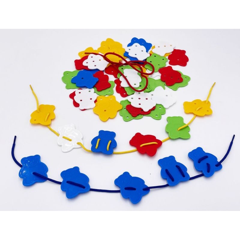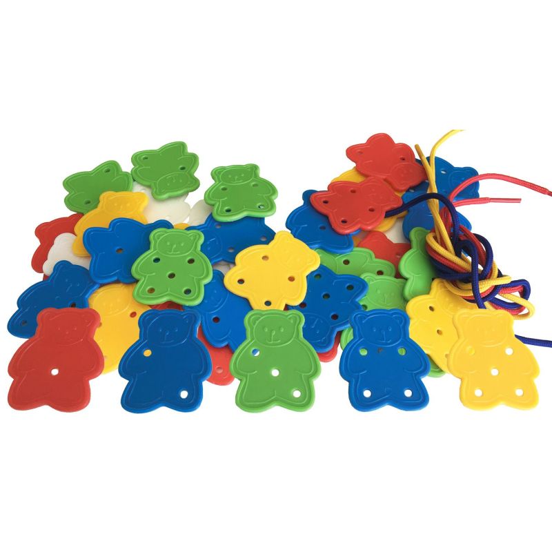50 ositos en plástico resistente con orificios para pasar los cordones.
