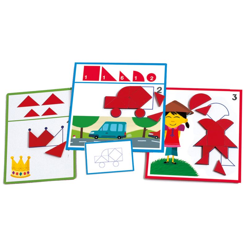 - Tres niveles de dificultad: verde el más sencillo, azul en el que se indica la cantidad y la forma de las piezas a utilizar y el nivel rojo donde no se indica ni cantidad ni figura.