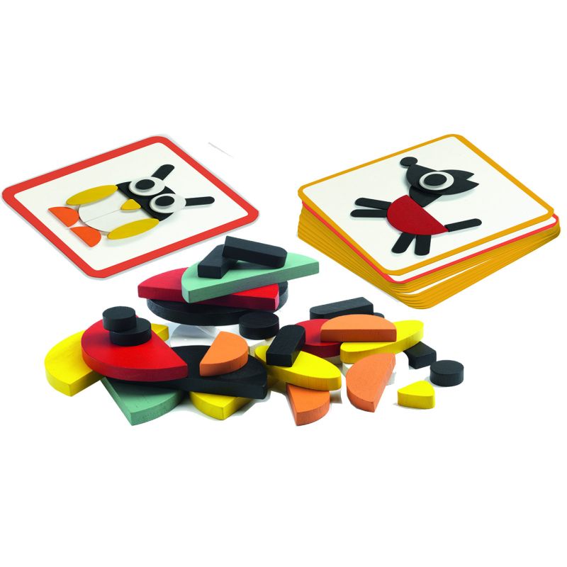 30 piezas de diferentes formas geométricas realizadas en madera de diferentes colores.