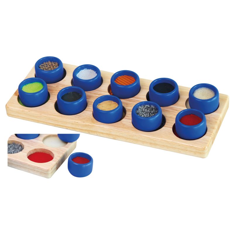 - 10 texturas diferentes: arpillera, pelota de tenis, caucho,cartón ondulado, madera, silicona, alfombra, velcro, esponja y tela.