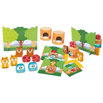 8 piezas de madera con diferentes motivos: oso, zorro, pájaro y setas.