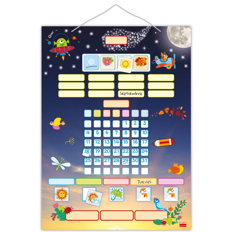 - Rellena los huecos con las fichas y con el rotulador para indicar el año, la estación, el mes, el día de la semana en número, el día de la semana en letra y el tiempo del día.