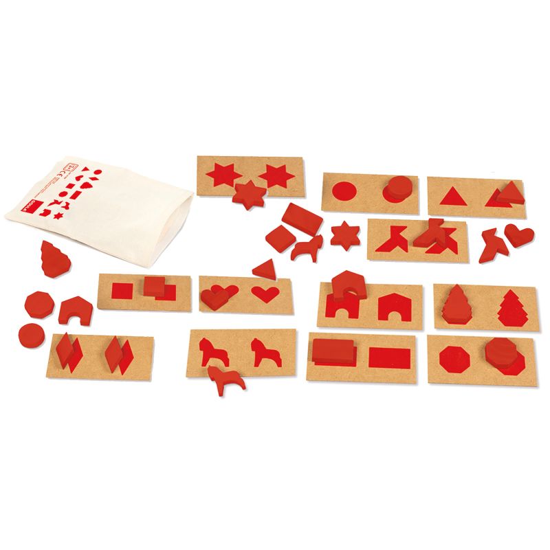 12 tableros de madera de 16 cm x 18 cm que reproducen la silueta de dos figuras idénticas.
