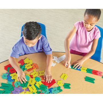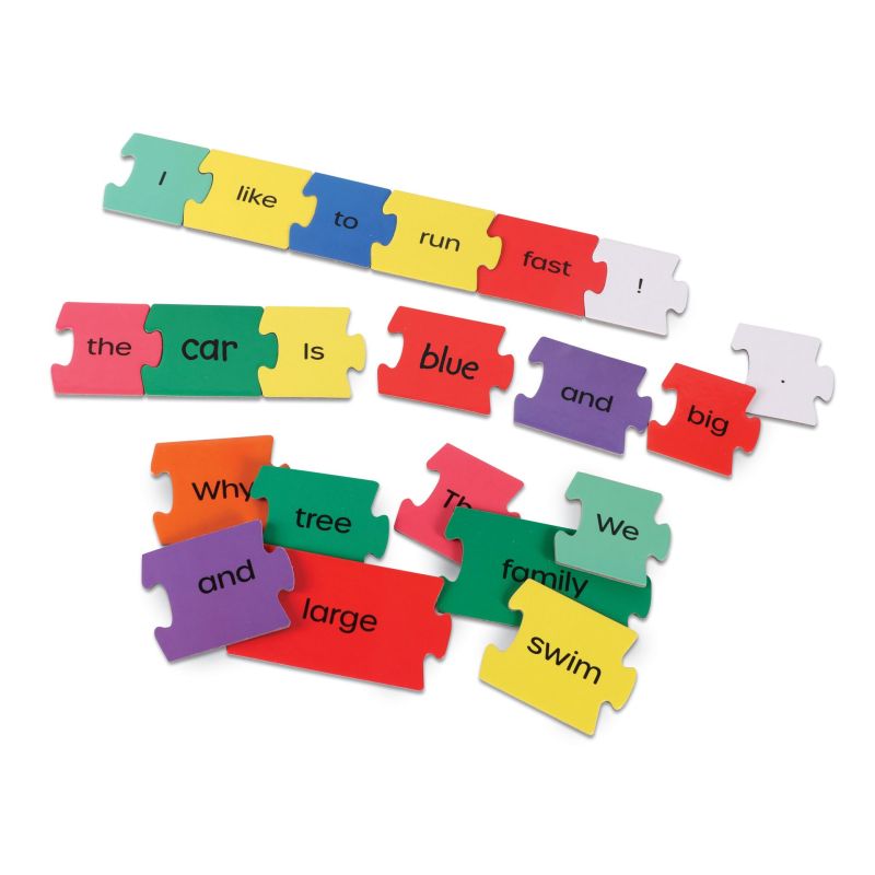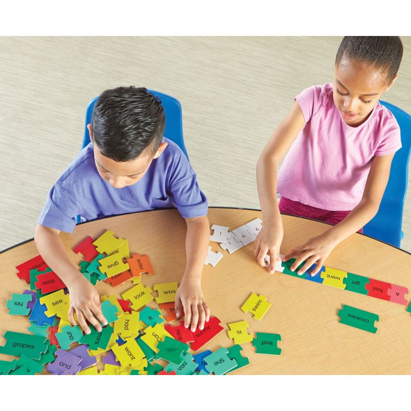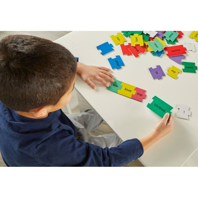 112 piezas de doble cara con 200 palabras y símbolos de puntuación, 24 piezas en blanco para que los niños escriban sus propias palabras y guía de actividades.