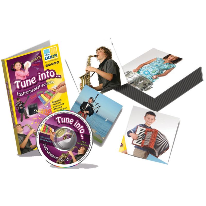 30 imágenes con diferentes instrumentos realizadas en cartón plastificado.