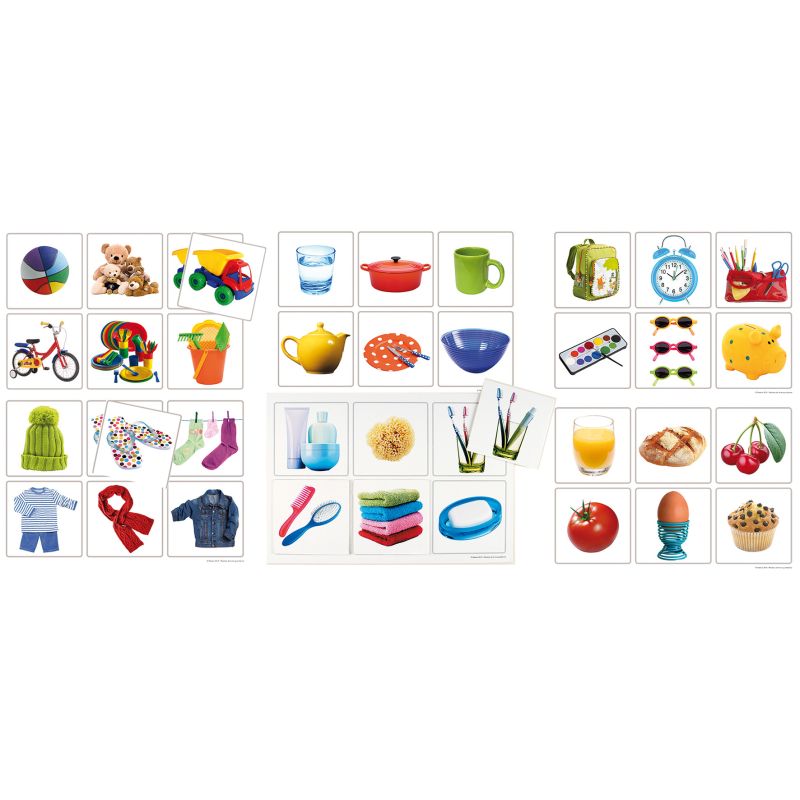6 láminas de 33x23 cm. Cada lámina está dedicada a un tema: la cocina, los juguetes, la ropa, el cuarto de baño, los alimentos y los objetos.