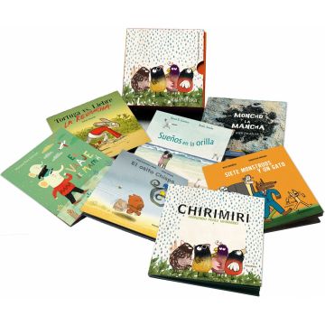 7605016: ¡Las obras más conocidas, reunidas en una cajita de libros... pequeños y sueños... muy grandes! Esta caja contiene los siguientes títulos: · Chirimiri · El viaje de Mamá · Sueños en la orilla · El osito Chispa · Tortuga vs. Liebre. La revancha · Siete monstruos y un gato · Moncho y la mancha 7 titulos de 7x7 cm.