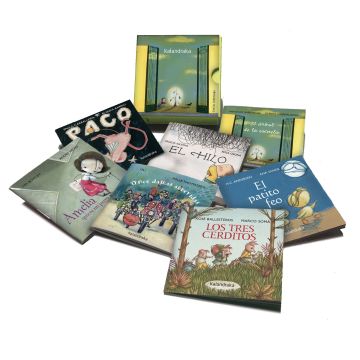 7605012: ¡Las obras más conocidas, reunidas en una cajita de libros... pequeños y sueños... muy grandes! Esta caja contiene los siguientes títulos: · El árbol de la escuela · El hilo · Amelia quiere un perro · Los tres cerditos · Paco · El patito feo · Once damas atrevidas 7 titulos de 7x7 cm.
