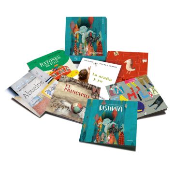 7605014: ¡Las obras más conocidas, reunidas en una cajita de libros... pequeños y sueños... muy grandes! Esta caja contiene los siguientes títulos: · Distinta · La mierlita · Ratones de viaje · La araña y yo · La familia · Abuelos · El principio 7 titulos de 7x7 cm.