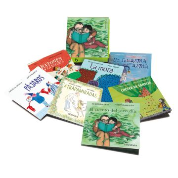7605015: ¡Las obras más conocidas, reunidas en una cajita de libros... pequeños y sueños... muy grandes! Esta caja contiene los siguientes títulos: · El cuento del otro día · Atrapamiradas · Chófer de sandías · La mora · Pájaros · Ratones en la escuela · Un fantasma con asma 7 titulos de 7x7 cm.