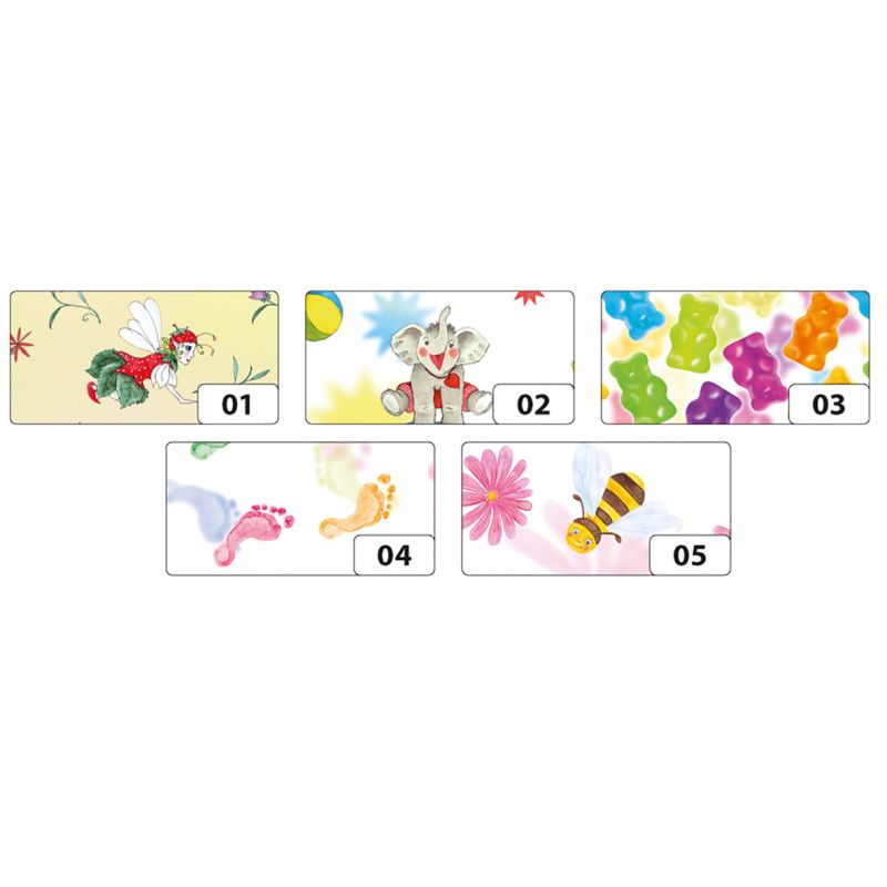5 motivos diferentes: abejas, huellas, elefantes, ositos y elfos.