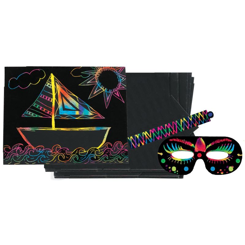 RASCALA: ¡Crea tu propio mundo lleno de color con estas láminas para rascar! - Estimula la imaginación y la creatividad. - Desarrolla la imaginación y la creatividad. - Favorece la observación y la concentración. - Láminas con recubrimiento negro para rascar con el punzón. Especificaciones: 100 láminas multicolor con recubrimiento negro. Medidas: 15,5 cm x 15,5 cm.