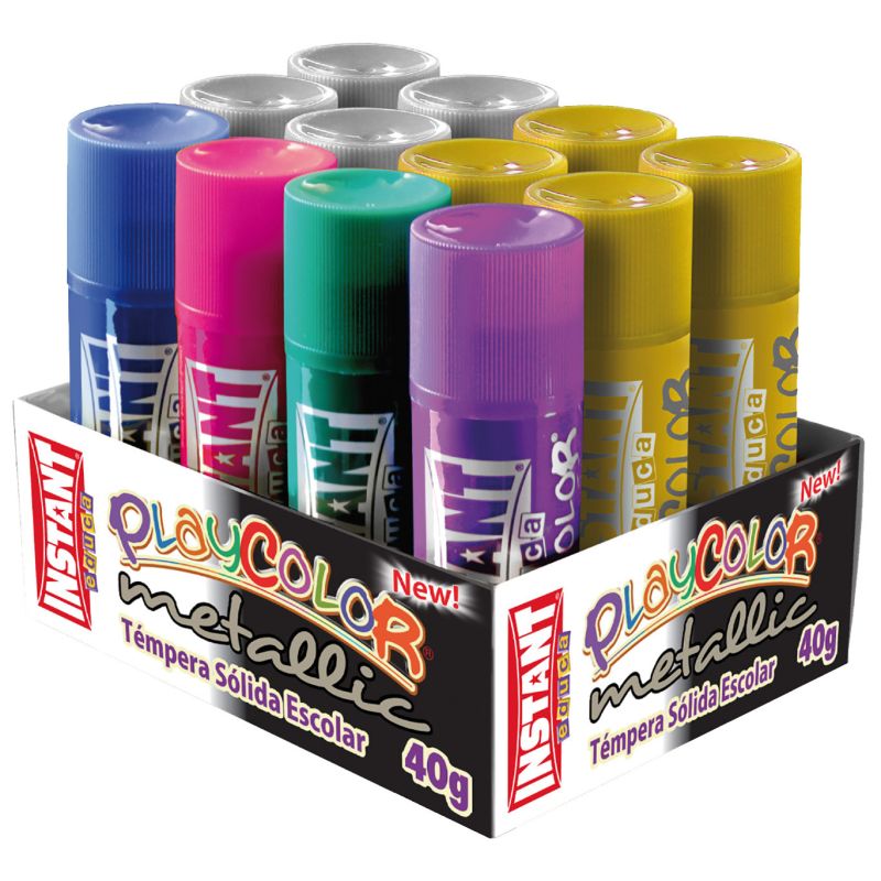 XLMETA: ¡Imagina y crea un mundo nuevo con las témperas sólidas de Play Color! - Desarrolla la coordinación y la motricidad fina. - Fomenta la imaginación y la creatividad. - No se necesita pincel ni agua, válidas para todo tipo de superficies. - Fáciles de usar, simplemente girando la punta. - Gran capacidad cubriente. - Elige el formato que quieras: - 12 colores metálicos. - 12 colores básicos. Especificaciones: Edad recomendada: a partir de 3 años. Sin parabenos ni alérgenos. Medidas: 3 cm de diámetro x 10,5 cm de largo.