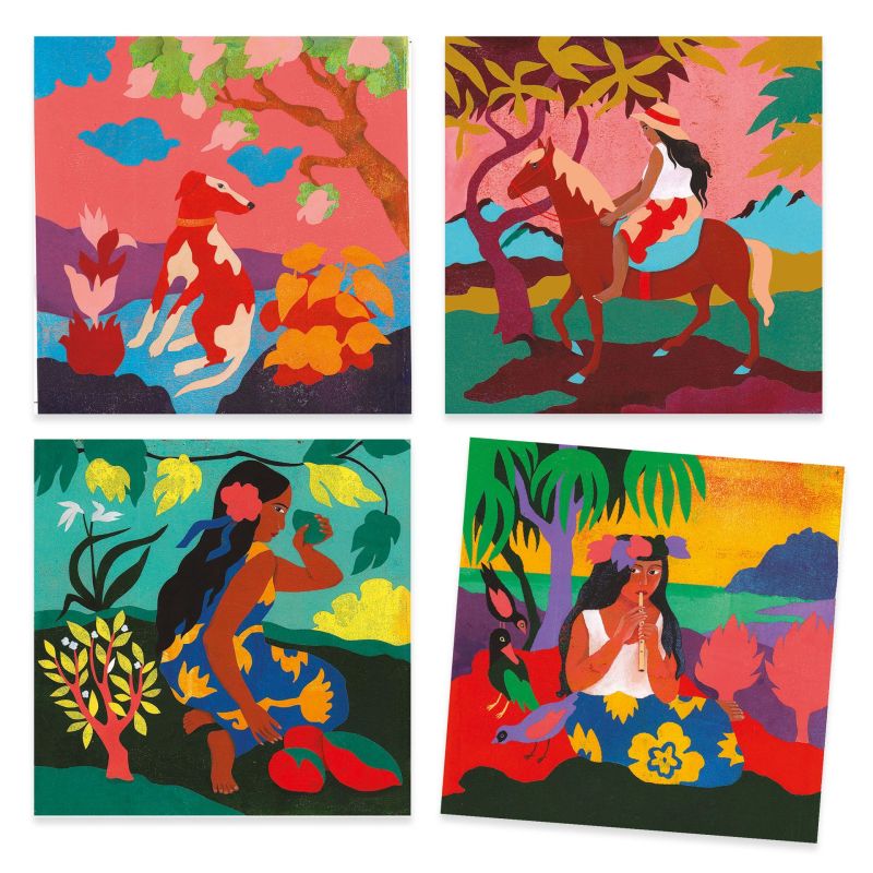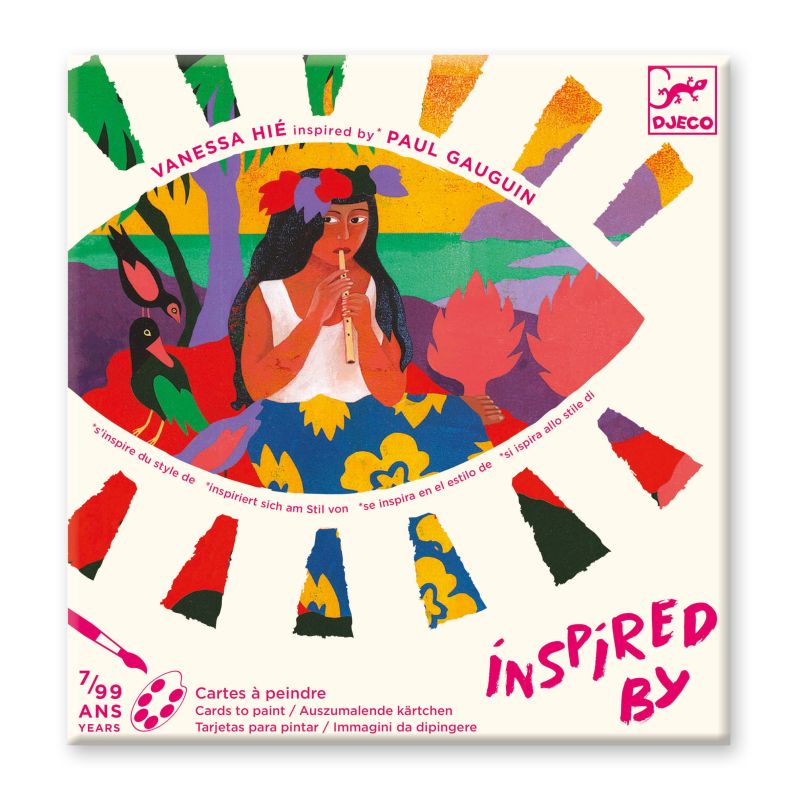Contenido: 4 tarjetas ilustradas, 4 paletas de cartón grueso con acuarelas, 1 pincel y manual de instrucciones.
