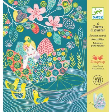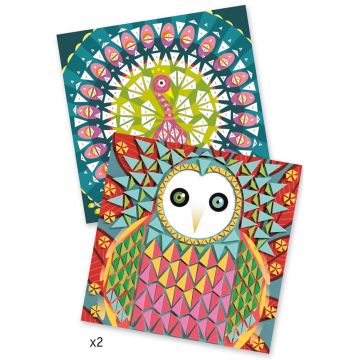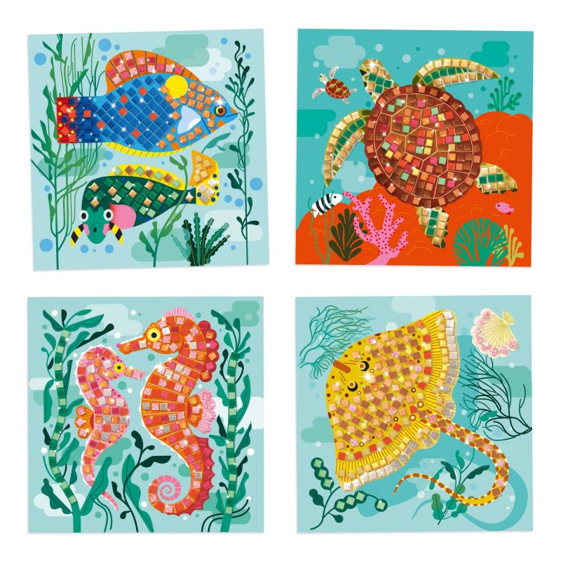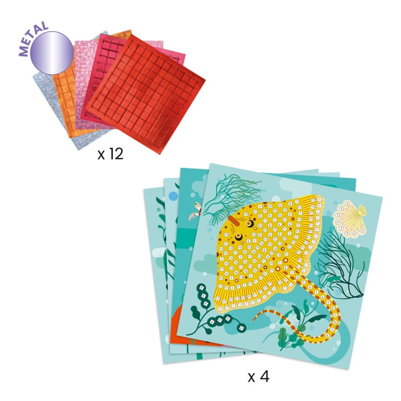 Contenido: 4 tarjetas ilustradas, 12 planchas de cuadrados de espuma autoadhesiva con purpurina y manual de instrucciones.