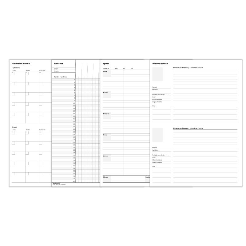- Cuaderno único que permite al docente tener: evaluación, planificación y tutorías en un solo ejemplar.