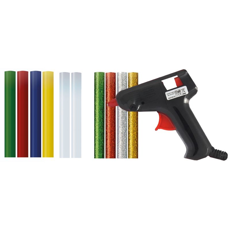 BCOGLI: - 12 barras de adhesivo termofusible. - 5 colores con acabado de purpurina: 3 barras oro, 3 barras plata, 2 barras rojo, 2 barras verde, 2 barras azules. - No gotea. - Válidas para cualquier material. - Secado rápido.