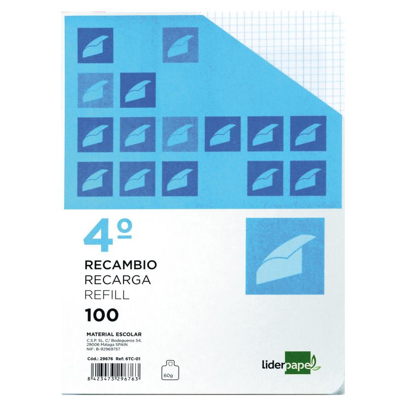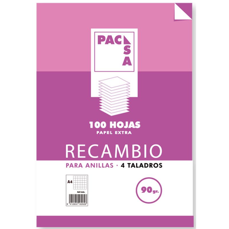 RECC2C4: ¡Escribe y anota en este fantástico recambio cómodo y práctico! - Papel blanco extra de 60 gramos. - Tamaño A5. - Rayado de color azul con encabezado. - Elige el diseño adecuado entre: o Cuadro de 4x4 milímetros. o Cuadro de 6x6 milímetros. o Cuadro de 8x8 milímetros. o Pauta de 2,5 milímetros. o Liso. - Multitaladro. - 100 hojas.