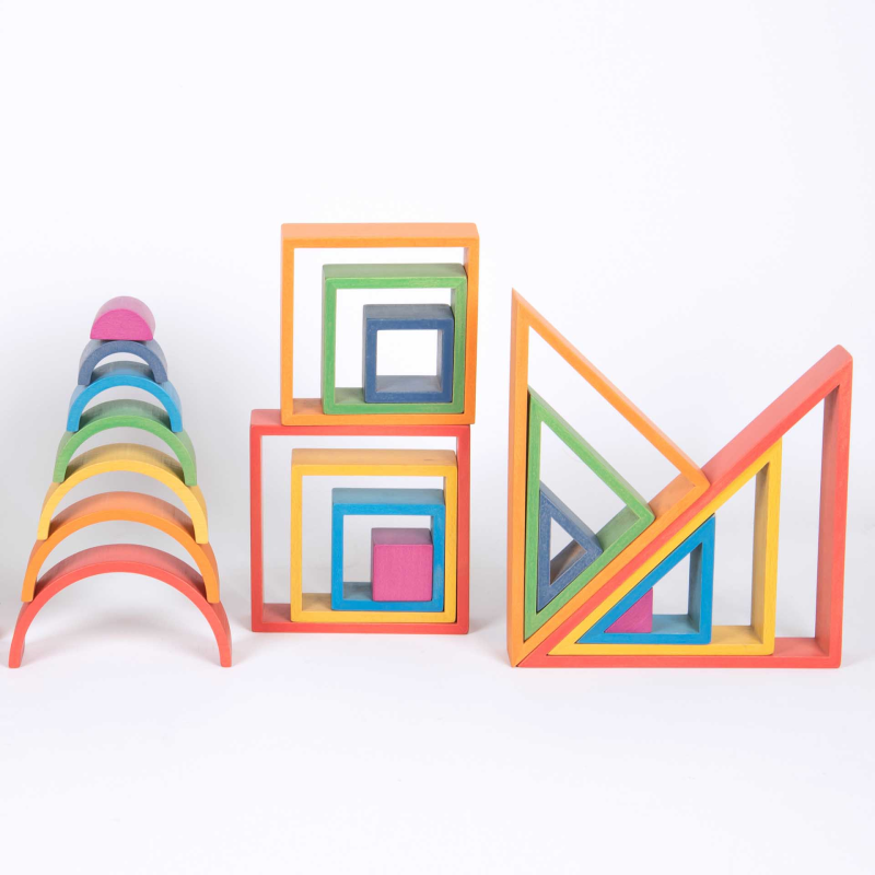 Piezas geométricas basadas en la metodología Montessori, mediante la cual los más pequeños adquieren el conocimiento abstracto a través de lo concreto y manipulativo.