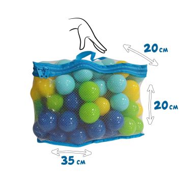 301064: Bolsa con 100 bolas de 6 cm de diámetro en colores surtidos. Realizadas en plástico resistente y ligero. Con bolsa de transporte.