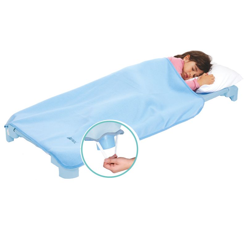 401035: Sábana doble de color blanco, como un saco de dormir. Con gomas elásticas para su fijación. 50% algodón y 50% poliéster. Permite el lavado amáquina a temperatura de hasta 90º, y además, el uso de lejías.