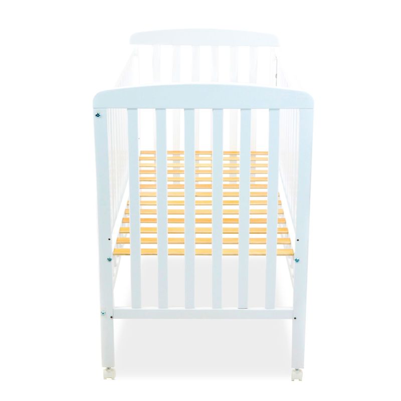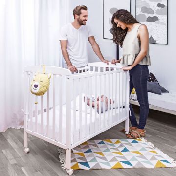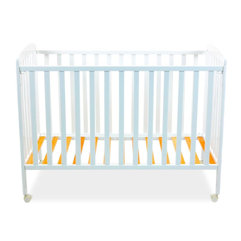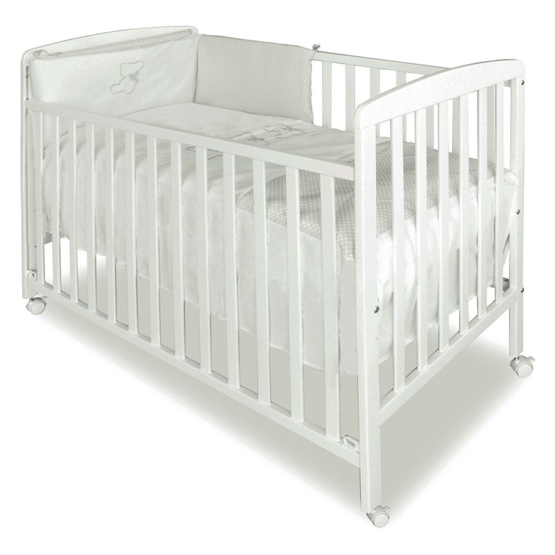 401069: ¡Logra el mejor descanso de tu bebé! Estructura de madera 100% Haya, lacado color blanco. Diseño moderno de lineas limpias. Somier regulable en tres posiciones (22-48 cm.). Lateral abatible. Ruedas con frenos. Estructuras redondeadas para mayor seguridad. Para colchón de 120x60 cm. (no incluido). Medidas: 123,70x64x95,80 cm. No incluye accesorios.