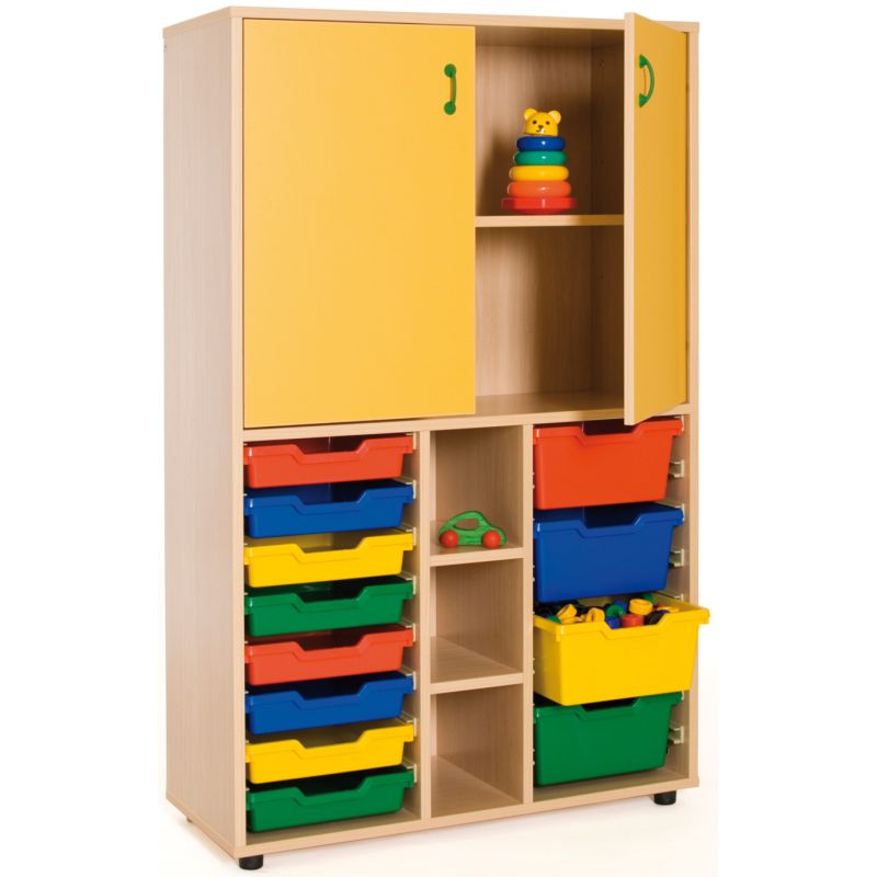 404031717: ¡Equipa tu espacio de trabajo y mantén el orden con este mueble medio con casillero, puertas y almacenaje! - Realizado en madera de alta calidad. - Tablero de melamina de haya de 19 mm. - 2 estantes con puerta en la parte superior. - Con 8 gavetas simples, 3 huecos de almacenaje en la parte central y 4 gavetas dobles. - Puertas con sistema de seguridad que evita el pillado de dedos. - Con niveles en las patas para elevar el mueble. - Elige el color que más te guste para el acabado de tu mueble. - Medidas: 40 cm x 90 cm x 147cm de alto. Especificaciones: PLAZO DE ENTREGA APROXIMADAMENTE 3-4 SEMANAS. Se sirve montado. Garantía del mobiliario: 5 años por defecto de fabricación.