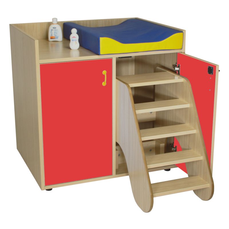 Con 2 puertas, con balda en el interior de una de las puertas y escalera giratoria en el interior de la otra. Fabricada en melamina colorhaya. 70x90x91 cm. de alto. Requiere colchoneta para cambiador de 70x50cm. de largo. No incluye cambiador.